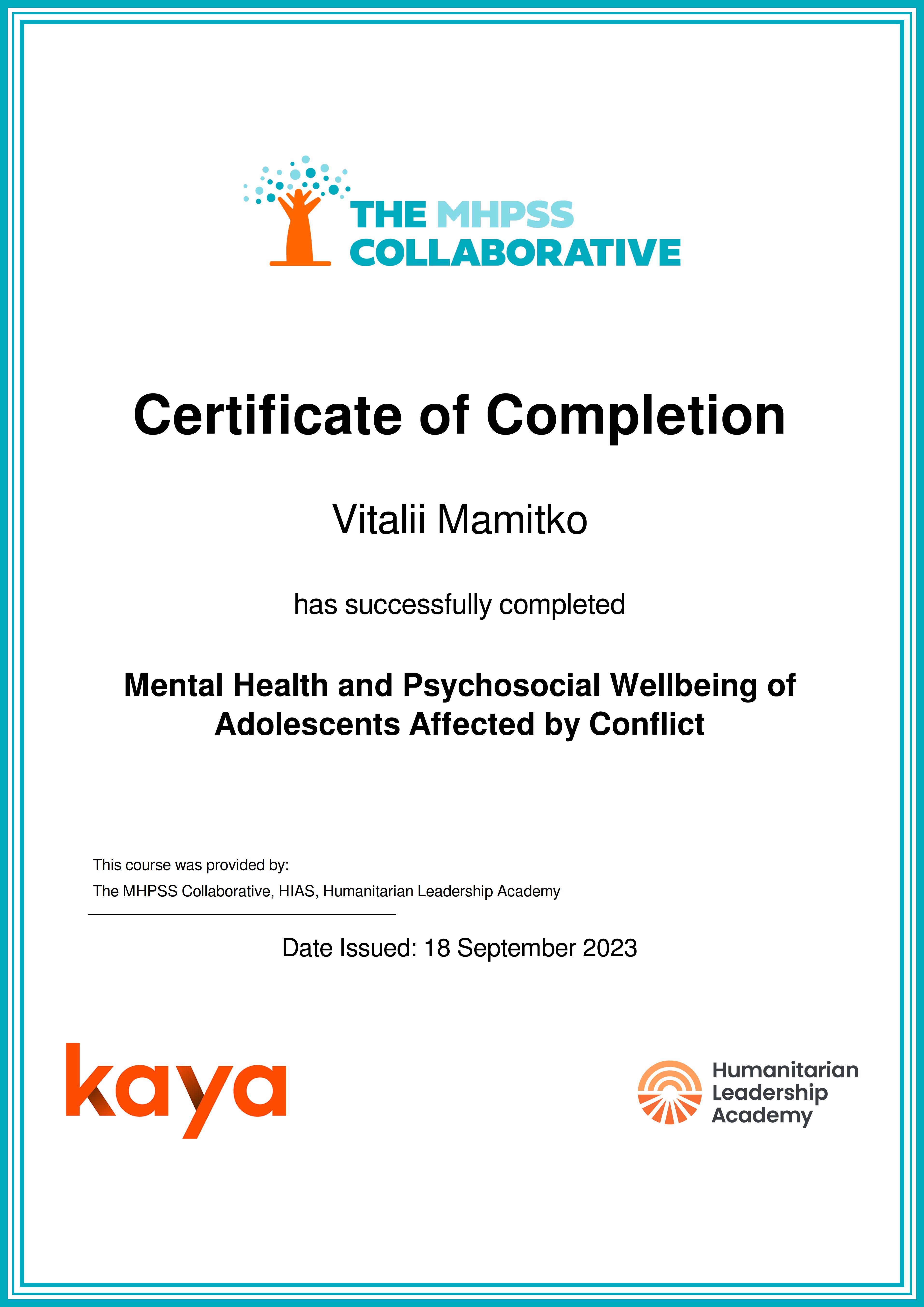 - Психическое здоровье подростков, пострадавших от конфликта. 18.09.2023 — Certificate of Completion: Mental Health and Psychosocial Wellbeing of Adolescents Affected by Conflict, онлайн-курс по психическому здоровью и психосоциальному благополучию подростков, пострадавших от конфликта (The MHPSS Collaborative, HIAS, Humanitarian Leadership Academy – платформа Kaya).