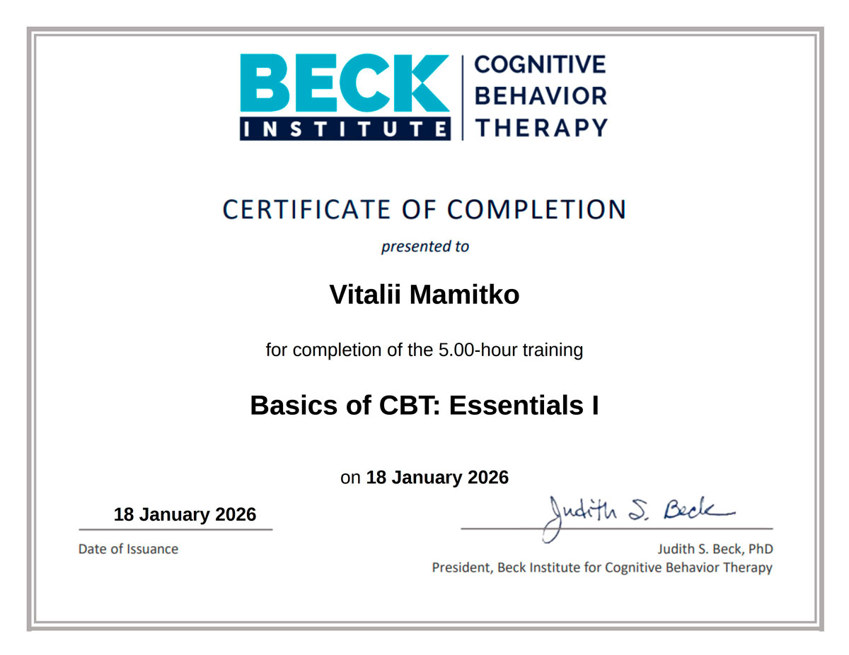 - Basics of CBT: Essentials I — Beck Institute (онлайн-обучение). 18.01.2026 — курс по основам КПТ, 5.00 часов (contact hours). Course Completion Certificate.