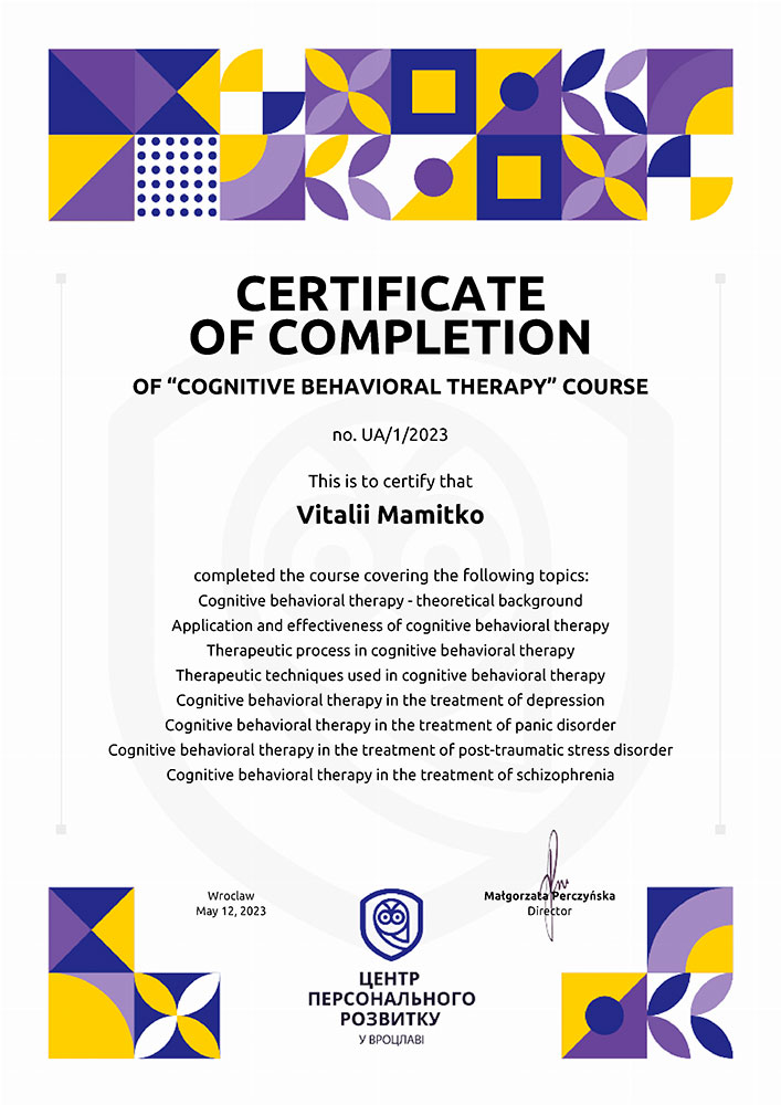 - Символдрама: депрессивные и психосоматические расстройства. 17.06.2016 — курс по программе «Психотерапия депрессивных и психосоматических расстройств методом символдрамы» (30 часов), «Психологическая лаборатория (PsyLab)», Киев. Номер сертификата: №1161.
