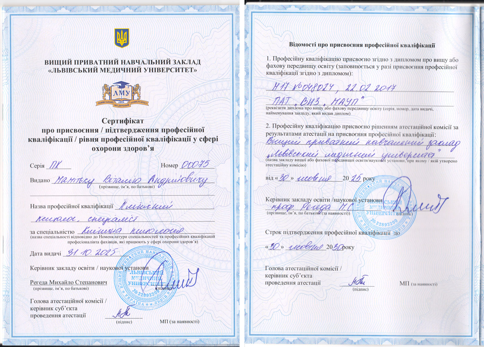 - Клинический психолог, специалист. 31.10.2025 — сертификат о присвоении профессиональной квалификации «клинический психолог, специалист» в сфере здравоохранения, выдан частным ВНЗ «Львовский медицинский университет», Украина. Серия и номер сертификата: ПК №00075.