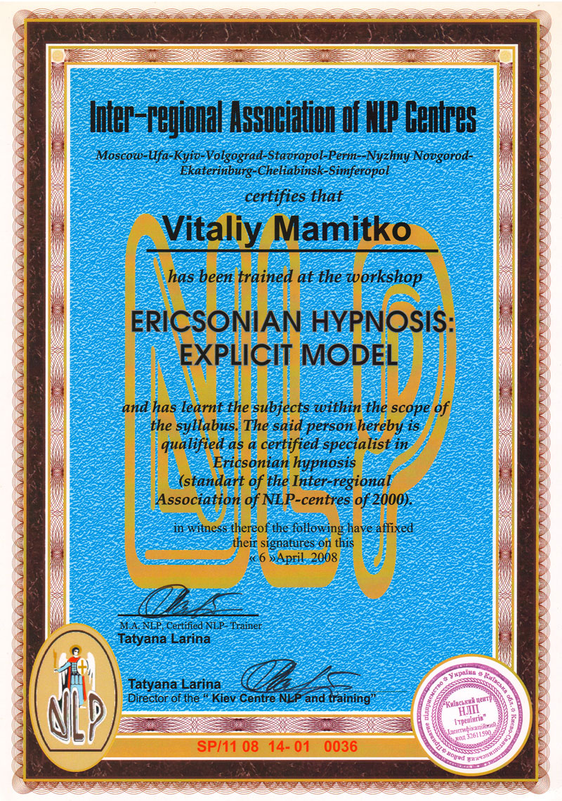 - Эриксоновский гипноз (Explicit Model). 06.04.2008 — Certified Specialist in Ericksonian Hypnosis: Explicit Model, сертификат специалиста по эриксоновскому гипнозу (Explicit Model), признан Kiev centre NLP and training. Номер сертификата: SP/11 08 14-01 0036.