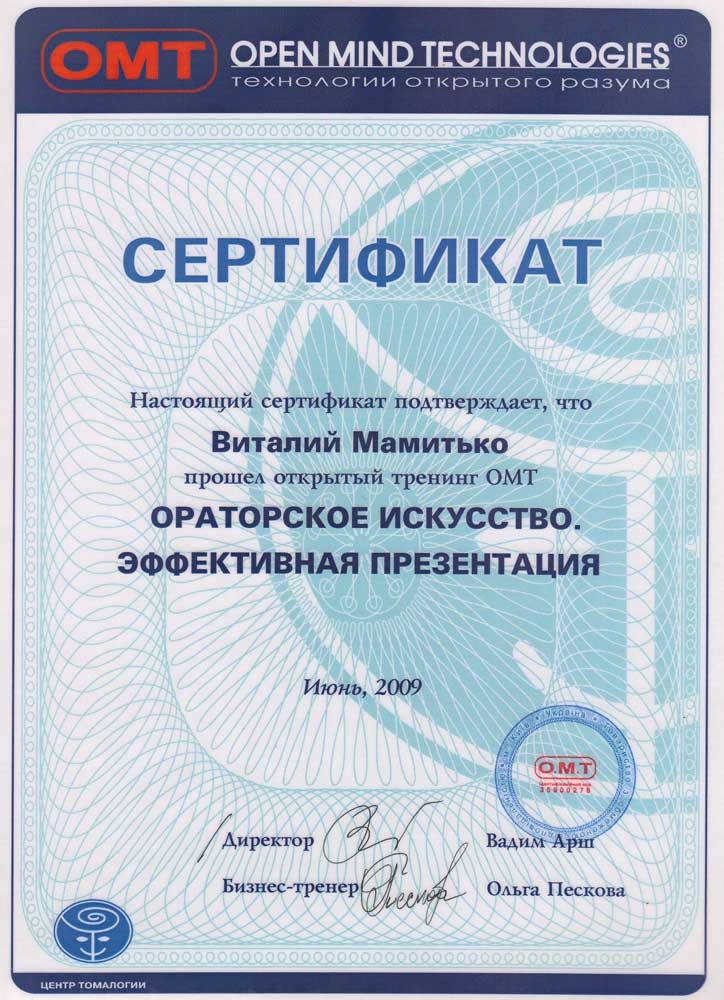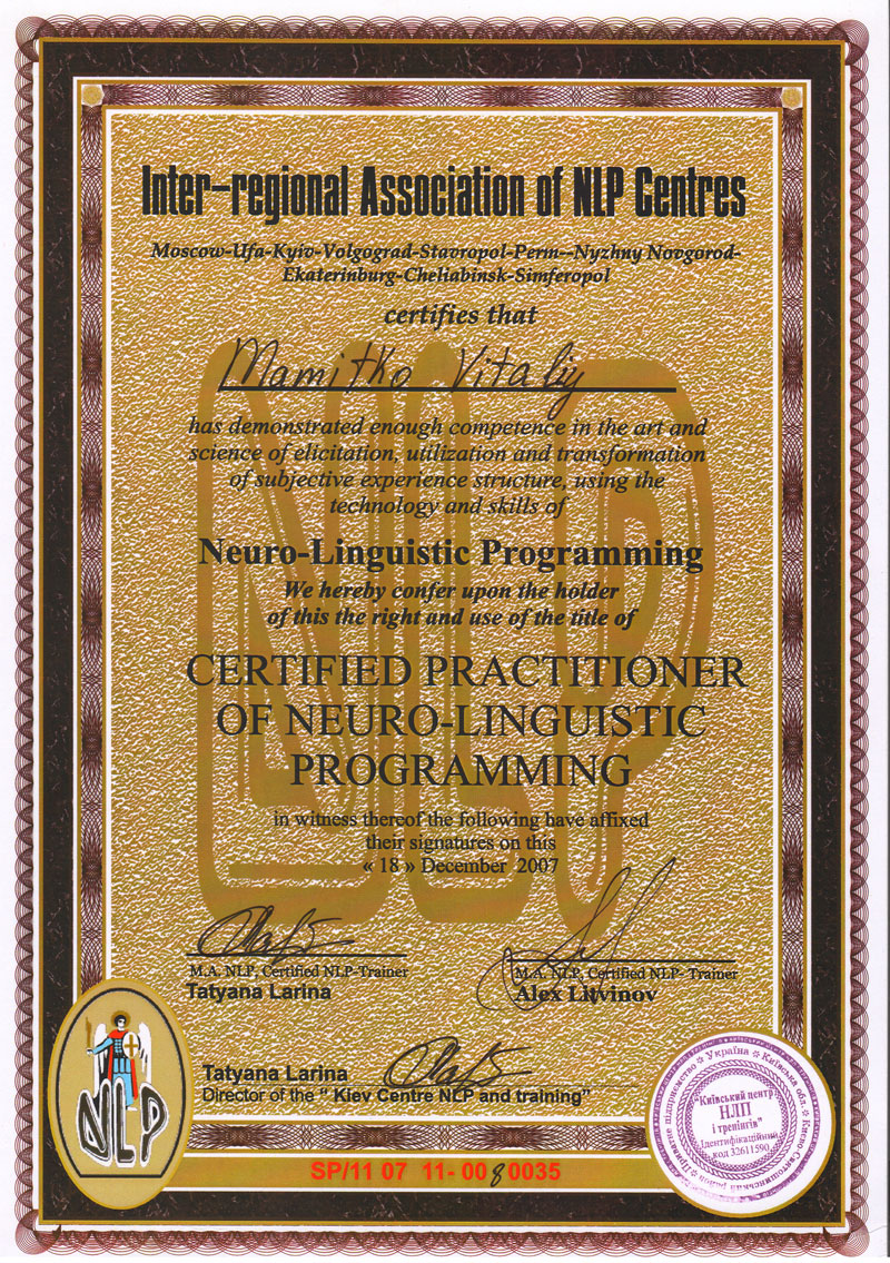 - NLP Practitioner. 18.12.2007 — Certified Practitioner of Neuro-Linguistic Programming (NLP Practitioner), подтверждение квалификации практика нейро-лингвистического программирования, признан Kiev centre NLP and training. Номер сертификата: SP/11 07 11-00 0035.