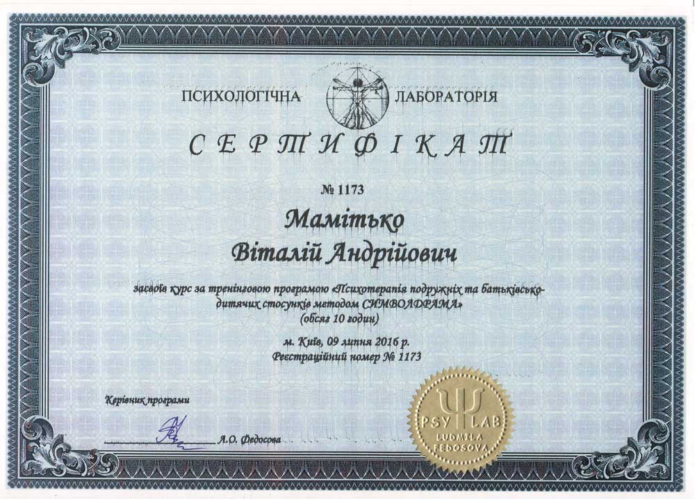 - Символдрама: супружеские и детско-родительские отношения. 09.07.2016 — курс по программе «Психотерапия супружеских и детско-родительских отношений методом символдрамы» (10 часов), «Психологическая лаборатория (PsyLab)», Киев. Номер сертификата: №1173.
