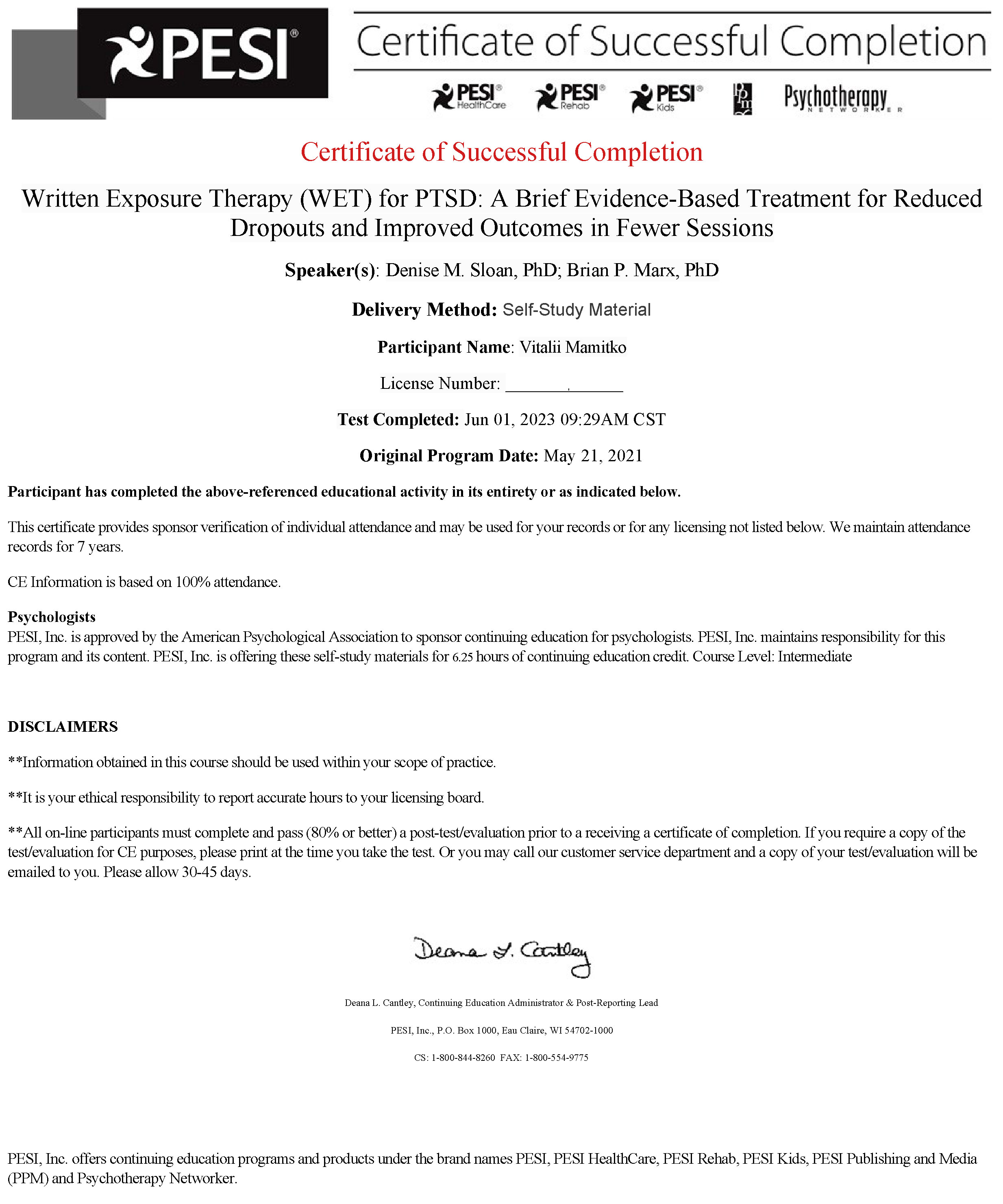 - Cognitive Processing Therapy (CPT) для ПТСР — интенсив. 29.08.2023 — Certificate of Successful Completion: 2-Day Intensive Training – Cognitive Processing Therapy (CPT) for PTSD and Related Conditions, 2-дневный интенсивный онлайн-вебинар, организатор PESI, Inc.